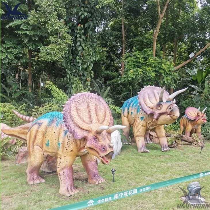 Ini adalah kumpulan arca Triceratops, anda boleh melihat dengan jelas corak kompleks permukaan badan Triceratops, yang dibuat dengan tangan oleh pekerja. Bahagian yang berbeza mempunyai garisan yang berbeza, dan walaupun dinosaur diperbuat daripada span, anda boleh melihat garisan kulit ini seperti kulit luar dinosaur yang keras.