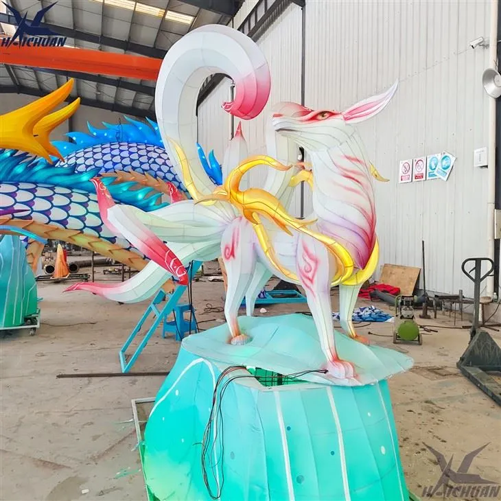 Makhluk Cina mitos berbentuk seperti musang dengan sembilan ekor. Kami menggunakan dawai besi tebal dan rangka keluli mengimpal bentuk musang berekor sembilan, tetap pada bentuk dengan tali pinggang lampu yang berubah warna, permukaan badan dengan ikatan sutera, dan akhirnya pelukis profesional akan menjadikan musang berekor sembilan ini lebih pintar dan cantik.